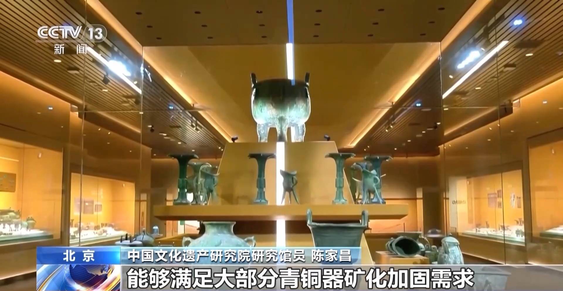 中国文化遗产研究院研究馆员 陈家昌:特别是围绕精细除锈,以及矿化青铜器渗透加固,我们做的模拟试块,能够渗透到青铜器锈蚀处6个毫米左右,真实青铜器修复大概就是有个半厘米左右,能够满足大部分青铜器矿化加固需求。